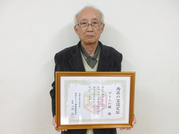 令和7年10月、野方萩ヶ丘北公園(萩ヶ丘自治会)にある「アトムの樹」が西区まるごと博物館推進会より、西区の宝に認定されました。