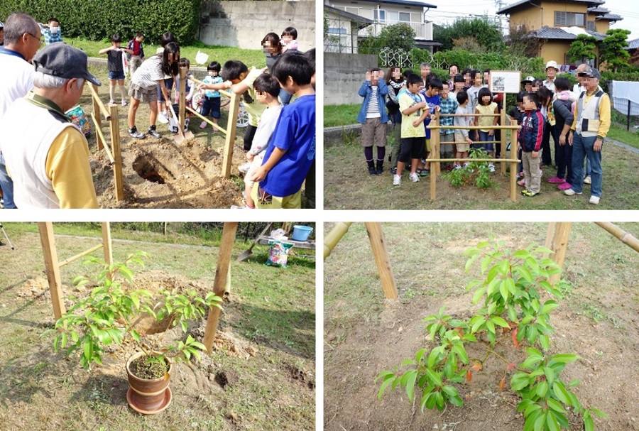 この「アトムの樹」と名付けられたクスノキは、2013年11月4日に、萩ヶ丘町内の有志の人々により苗木の時に植樹されました。苗木は長崎市内にある山王神社にあるクスノキの種子から育てられたものです。