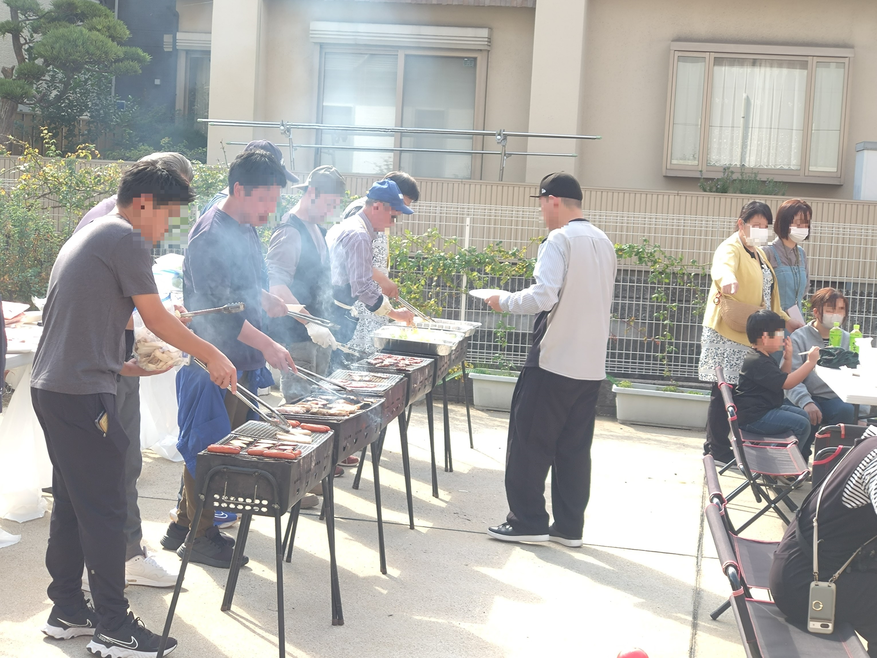 子どもから大人まで全世代の方々が参加。お肉やお野菜、焼きそばが焼きあがり、みんなそれぞれにお皿を持ってもらいに行きます。コロナ禍前までは毎年開催していましたが、久しぶりの交流会。「はじめまして」も「お久しぶり」も皆さんウエルカム♪和気あいあい楽しみました。
