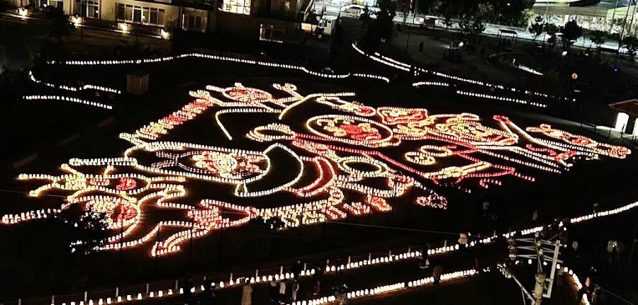 例年通り西都北小学校、西都小学校の児童、いとぽっぽ保育園児の作品約1,300点を公園内に展示するとともに、山ノ鼻古墳公園の古墳丘やグラウンドを、総数約8,500個の灯明の光で包みました。