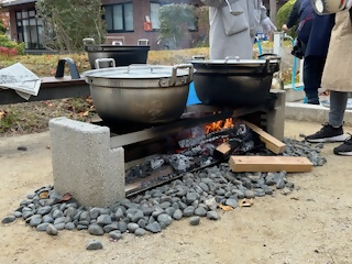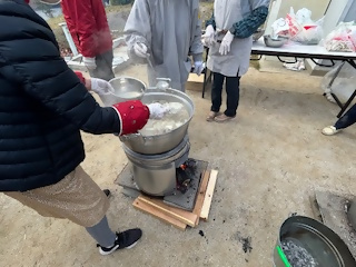 会場の外では、ふれあいサロンなどを開催している住民グループ「サン友会(さんゆうかい)」による豚汁の炊き出しの準備が進んでいました。