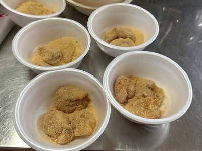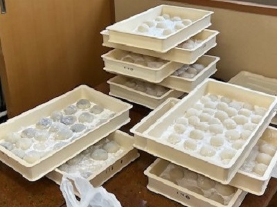 つきたてのもちは丸めて、ふるまい用と町内配布用に分けられます。地域のみなさんのベテランの技で、あっという間に小餅ができあがりました。
