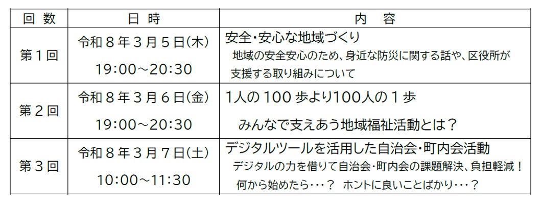 東区地域支援課では、持続可能なコミュニティづくりへ向けて、自治協議会や自治会・町内会へのさまざまな支援に取り組んでいきたいと考えており、その一環として、自治会・町内会長のみなさまを対象に3つのテーマで研修会を開催します。