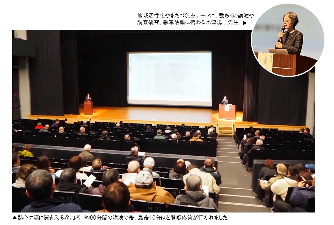 演題は「担い手不足解消に向けた 新たなコミュニティ運営について」。地域活性化・まちづくりコンサルタントで、合同会社フォーティR&C代表の水津陽子先生を講師に迎え、これからの地域活動のあり方についてお話しいただきました。