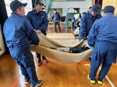 ▲搬送訓練:まずは消防団員が見本を見せてくれました