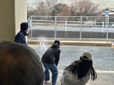 ▲水消火器訓練:見事に的に当たっています