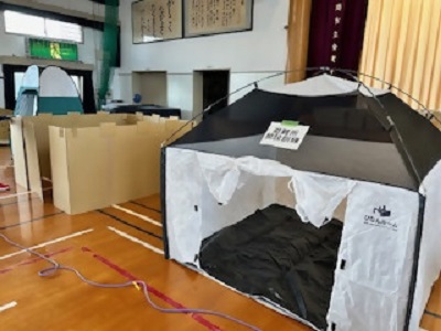 ▲避難用テント、段ボール間仕切りの展示