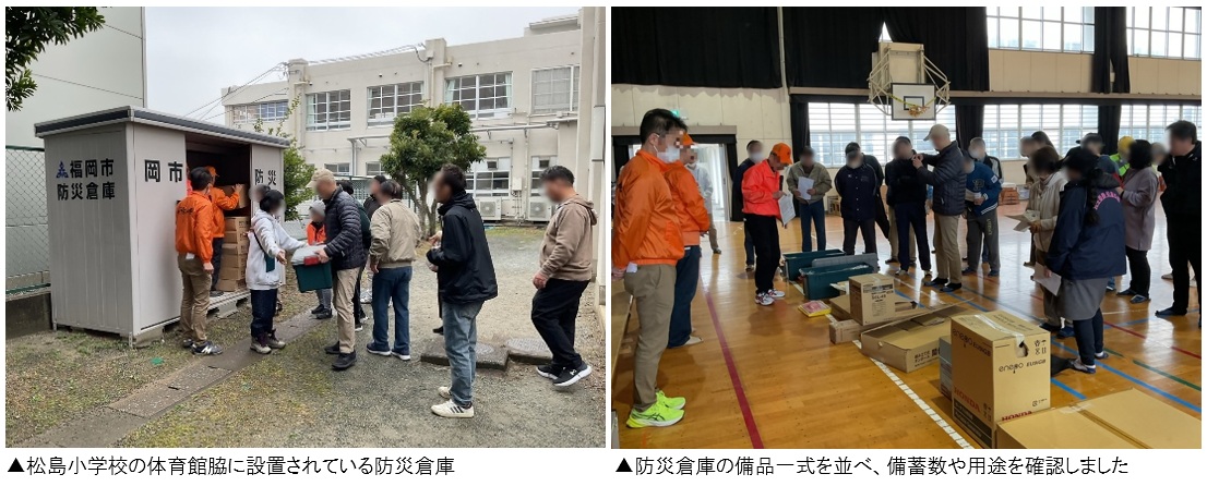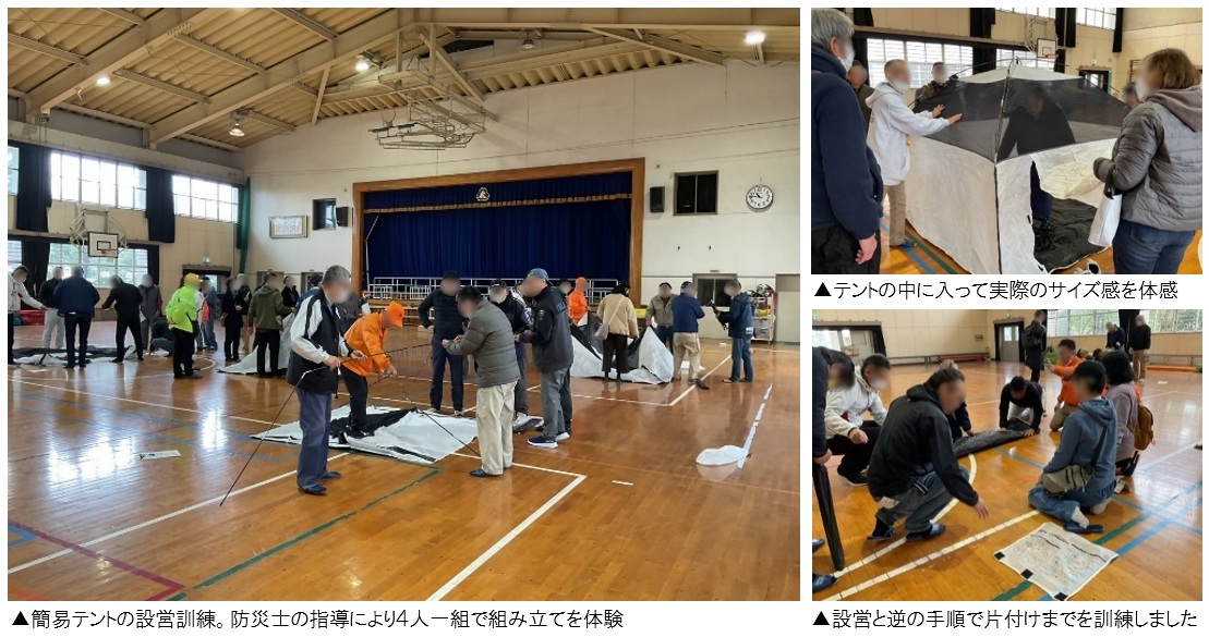 当日は、松島小学校に設置されている防災倉庫の点検を中心に、簡易テントや段ボール間仕切りの組み立て訓練を実施。あわせて、今後の地域防災のあり方について意見交換会も行われました。