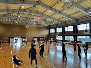 ふらばーるバレーボールは、バドミントンコートを使って、おにぎりのような形の柔らかいボールをワンバウンドで相手コートに返し得点を競います。