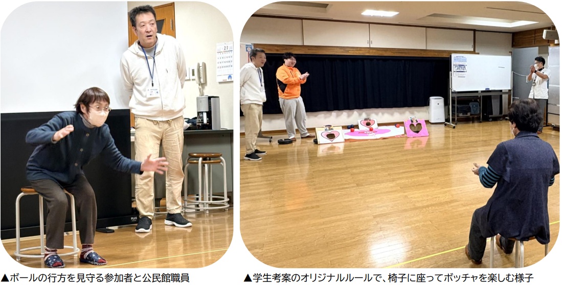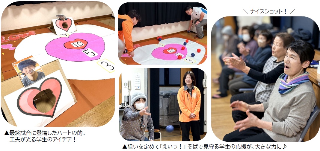 その後は、学生が考案したオリジナルルールのボッチャに挑戦!ハート型の的をめがけてボールを投げ、得点を競いました。カーリングのように相手のボールを押し出すこともでき、作戦を考える楽しさもあります。試合が進むにつれて参加者もコツをつかみ、高得点を狙うだけでなく戦略的な一投も見られました。