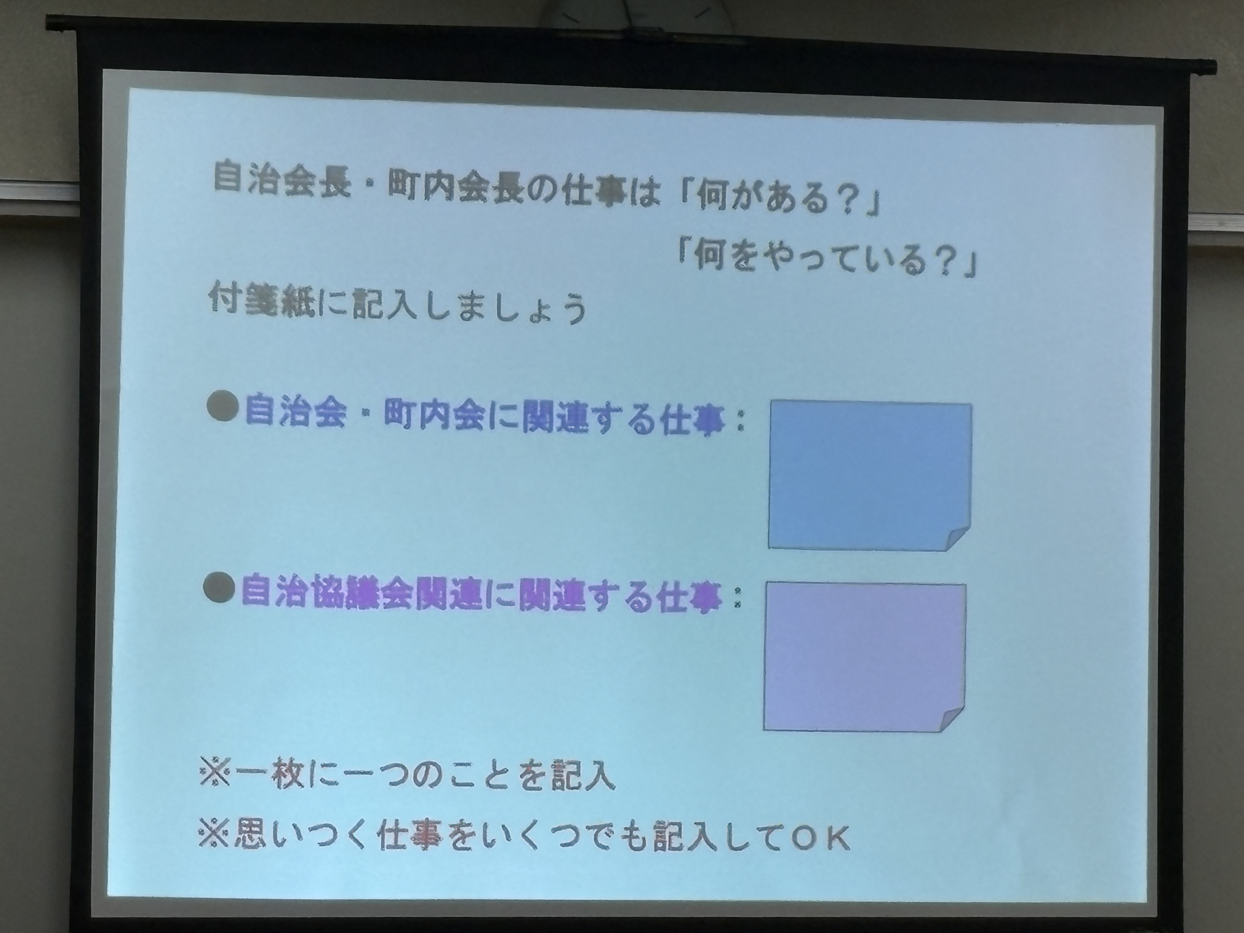 その後、With Labo 貞清 潔さんを講師に招き、自治会長らが交流を深めながら「ブレインストーミング」を実施。
