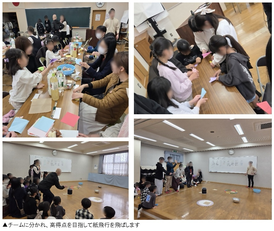 早速、ゲーム大会が始まりました。一つ目のゲームは紙飛行機飛ばしです。受付で配られた折り紙を使い、それぞれで思い思いの紙飛行機を作ります。大人にとっては久しぶりの紙飛行機づくり。子どもたちから折り方を教えてもらう場面もあり、自然と交流が進んでいきました。