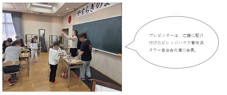 ひとしきりゲームで楽しんだ後、自治会の活動についての意見交換が行われました。参加した住民からは、マンション駐車場でのヒヤリハット情報の共有もされました。応援に駆けつけたビレッジハウス香椎浜タワー自治会の浦川会長からも自治会の存在意義についてお話がありました。「これから先、何があるか分からない。マンションだからこそ困ることもある。例えば災害が発生したときの一番の相談窓口になるのが自治会。同じ建物で多くの人が生活しているとさまざまな課題が出てくる。そういったことを解決していくためには、会長・副会長二人ではどうにも解決できない。できるだけ多くの方に協力してほしい。」と、ご自身の自治会の取り組みを紹介しながらアドバイスがありました。