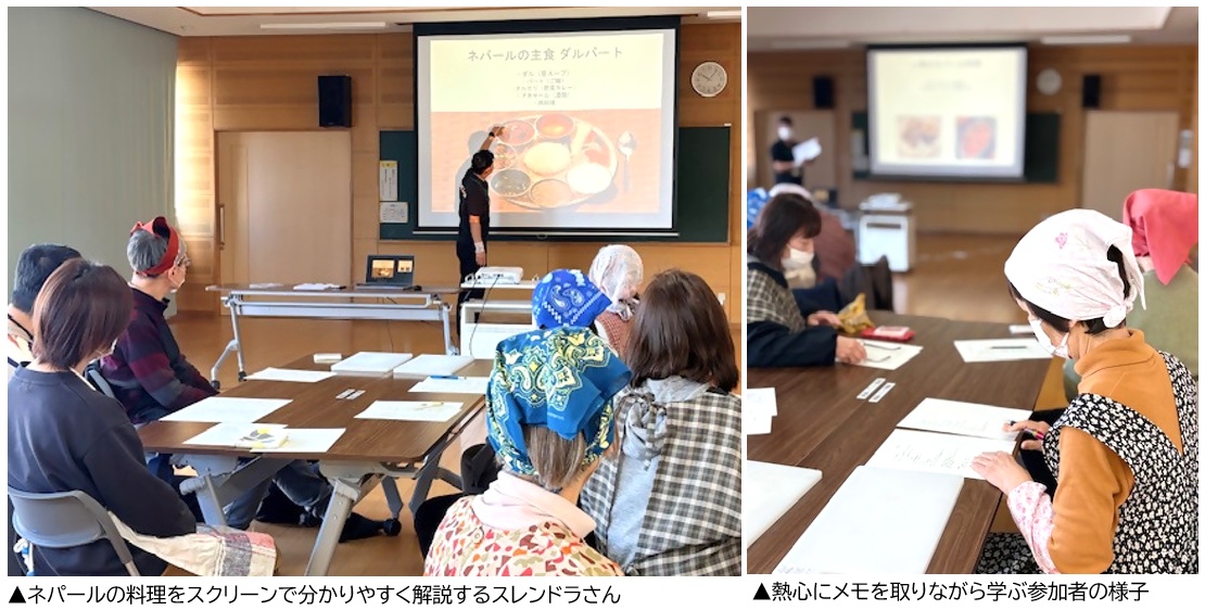 当日はまず、講師のスレンドラさんがスクリーンを使ってネパールの食文化を紹介。続いて学生がネパールの文化について説明しました。参加者は興味深そうに話に耳を傾け、講師を囲んで一生懸命メモを取る姿も見られました。