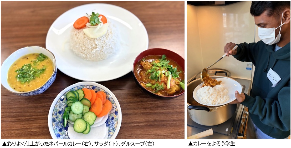 料理が完成すると、参加者は3つの班に分かれて食事を楽しみました。各グループには学生も加わり、ネパールカレー、サラダ、ダルスープを囲みながら交流を深めました。