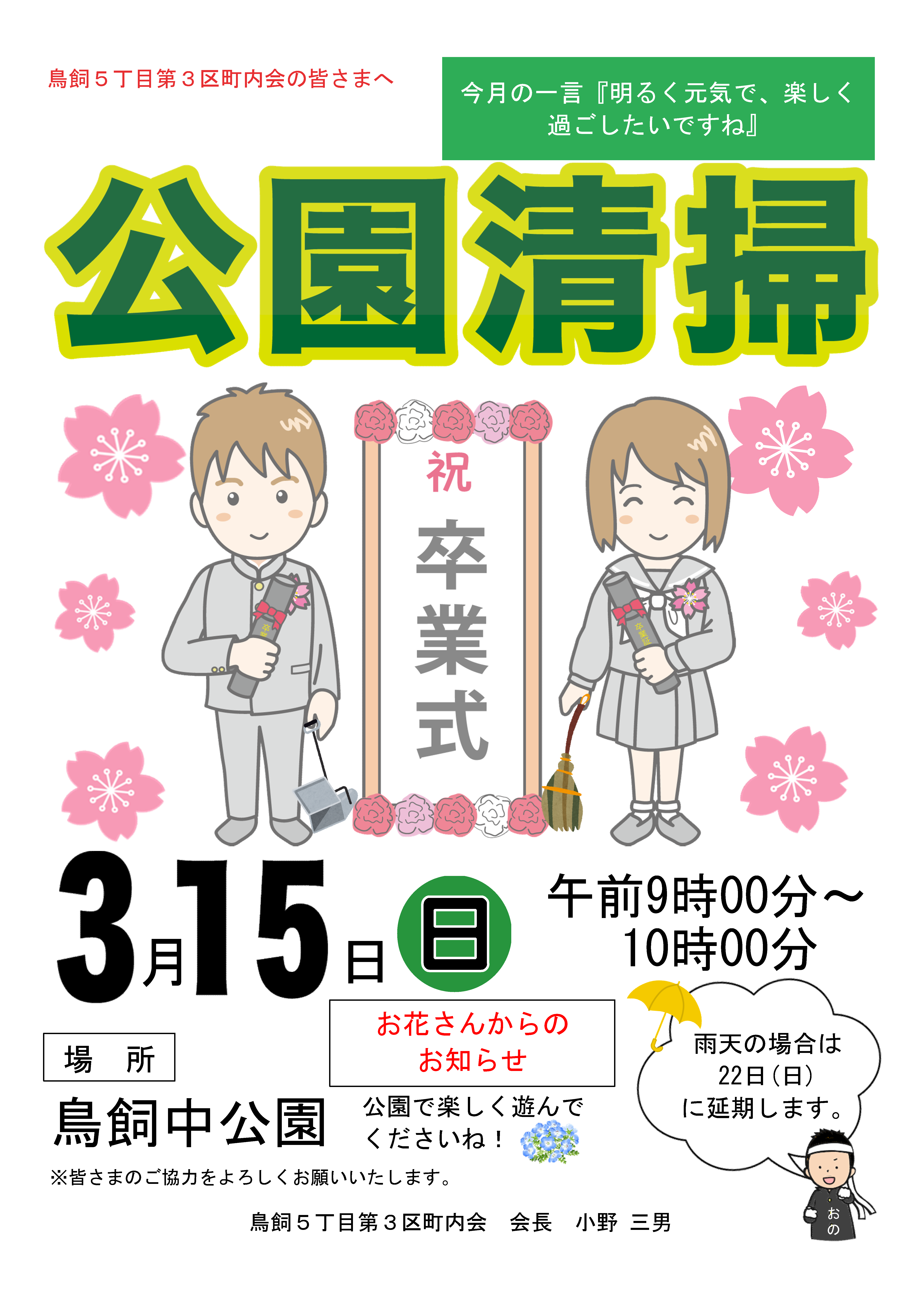 鳥飼5丁目3区町内会で毎月第3日曜日に開催されている公園清掃のお知らせです。