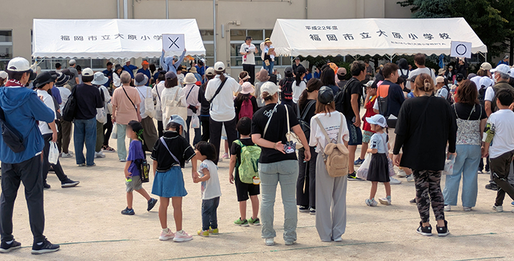 さらに全員がそろった後は「ごみ減量についてのクイズ」や「大原校区クイズ」で〇×形式の出題に挑戦。最初のクイズは、「福岡市で1年間に出るゴミの量は、ペイペイドームの1.5杯分、〇か×か」。皆さんはわかりますか?