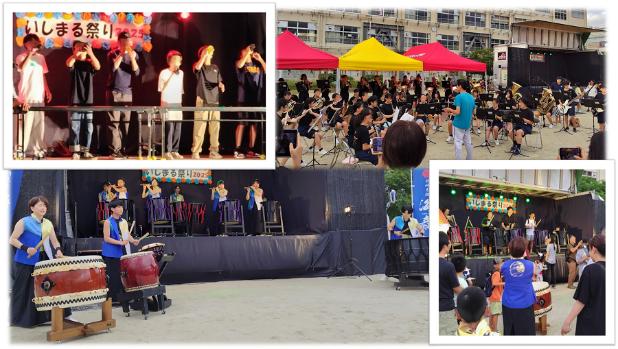 祭りは、午後5時に石丸校区自治協議会の岡会長の挨拶で始まり、下山門中学校吹奏楽部や北崎太鼓 海音(あまね)による演奏、さらにコーラの早飲み競争や太鼓の演奏体験などの催し物もあり、参加された皆さんは、お開きになるまで楽しまれていました。また、校区の各種団体が出店された駄菓子やかき氷などの夜店とキッチンカーには遅くまで列ができていました。
