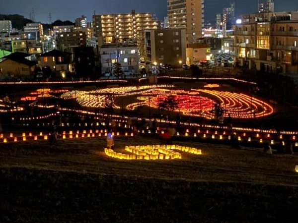 今年も西都・西都北小学校生徒や保育園児等が描いた灯明など、約7,000個の灯明が幻想的な地上絵となり、山ノ鼻古墳公園・山ノ鼻1号墳を飾ります。