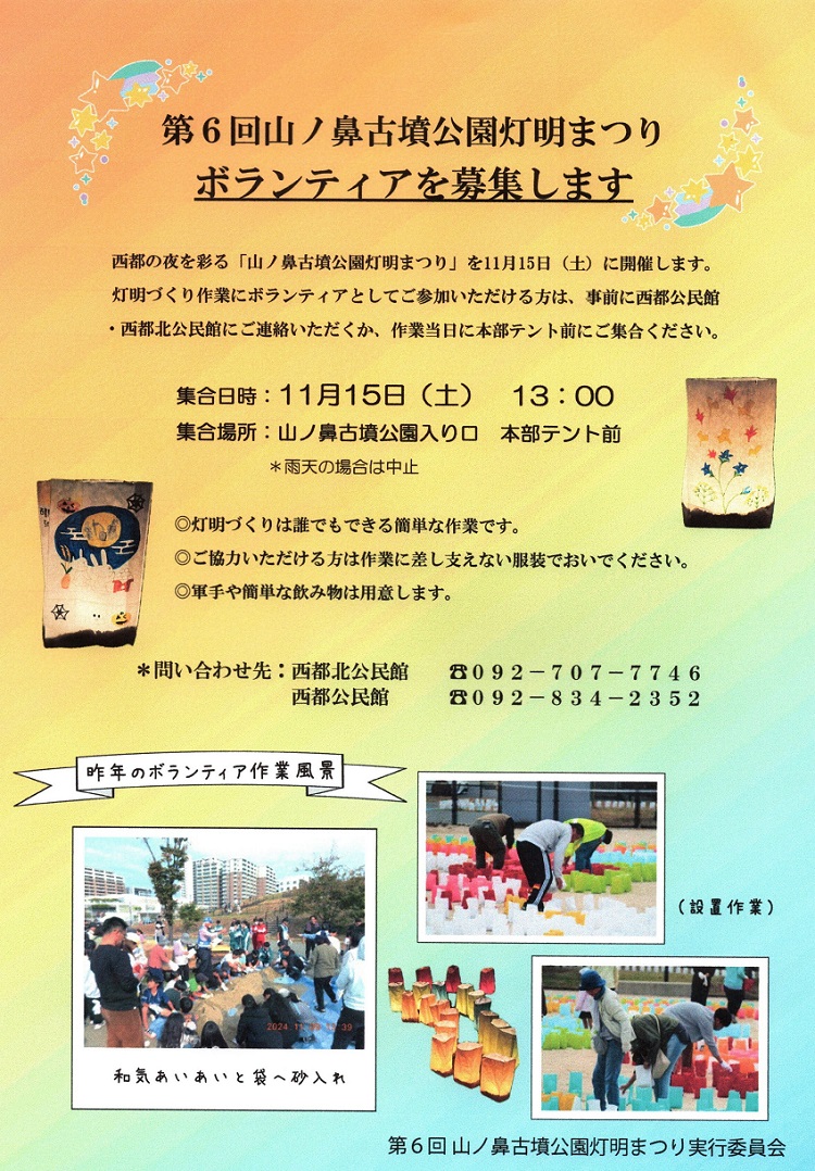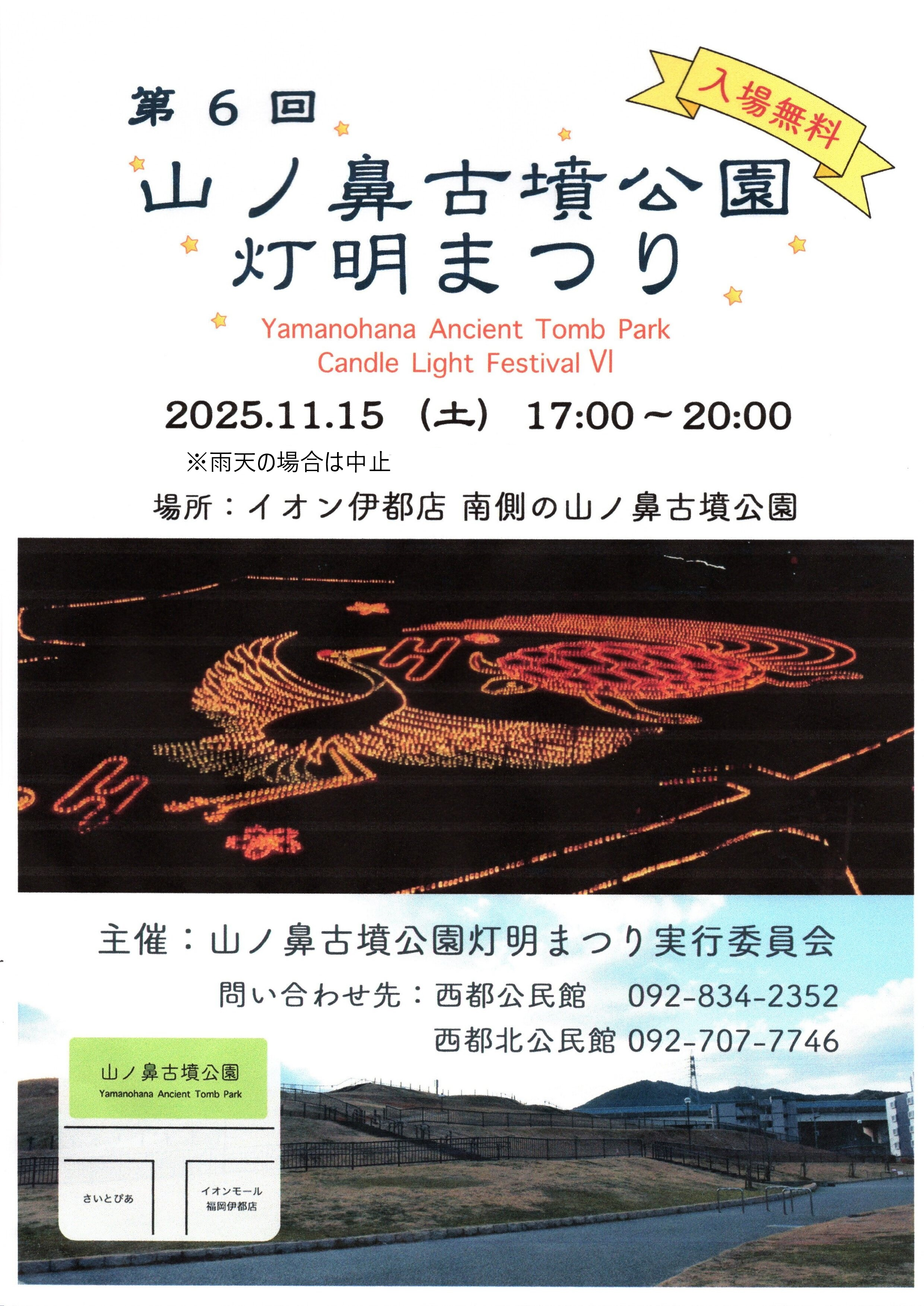 令和7年11月15日(土)、JR九大学研都市駅南側にある山ノ鼻古墳公園で「第6回山ノ鼻古墳公園灯明まつり」が開催されます。地区の伝統になりつつある「灯明まつり」は、毎年、テーマを変えながら、地域の子どもたちの灯明による作品を、校区内外の多くの方々に楽しんでいただいてきました。