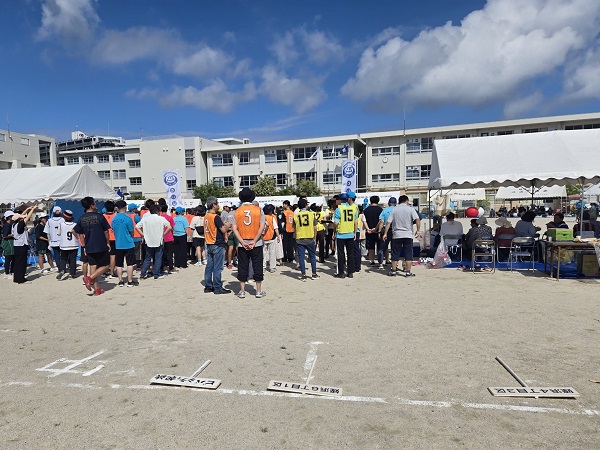 前日の雨がうそのように晴天に恵まれ、20町内会の選手や応援者が一堂に会し、運動会は盛大に開催されました。また大会運営のボランティアとして、姪浜中学校のソフトテニス部員やマリン病院の看護師が協力してくれました。