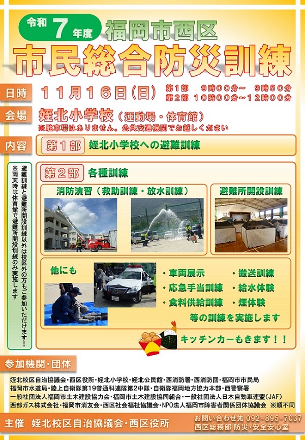 第1部(姪北校区町内毎の避難訓練)9時~9時50分、第2部(各種訓練)10時~12時