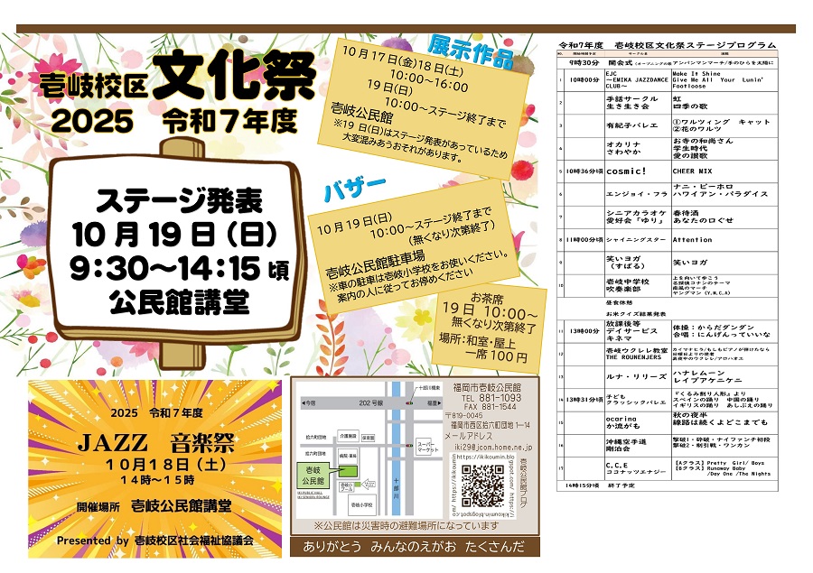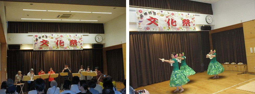 保育園の園児やディサービスセンターの利用者などの作品が展示され、2日目の18日は校区社回復し協議会主催の「JAZZ音楽祭」、最終日の19日は、サークルによる「ステージ発表」などが行われました。