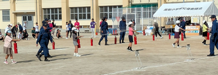 ヘルメットをバトン代わりにリレー方式で消火器を操作する「みんなで守ろう自主防災」。消防団の皆さんの指導を受け、的に向かって放水。