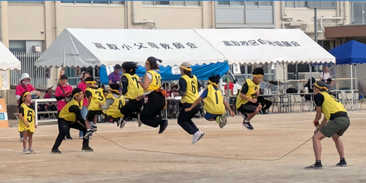 「ブロック対抗大なわ跳び」。縄(なわ)の回し方にもコツがあるようです。