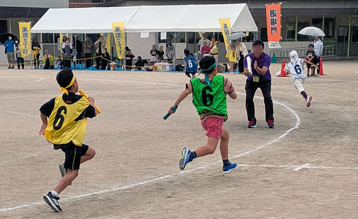 お昼の休憩後は、公民館のサークル紹介や参加者みんなでの踊り、パン喰い競走が行われ、最後の種目は「ブロック対抗リレー」です。あいにく雨が降り出しましたが、熱い声援を背に激走が繰り広げられました。